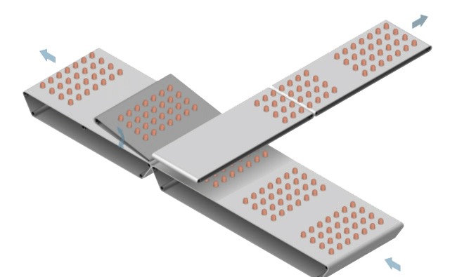 This system enables lateral discharge of product rows for continuous feeding into the packaging machine. It operates with either direct or indirect feed logic. In direct systems, products are transferred straight to the discharge belt and into the packaging line. In indirect systems, they are first collected on a plate belt and then transferred when ready. Additional discharge belts can be added for buffering if needed. Unused rows are redirected to an overflow or return feed system. Thanks to its hygienic design, all components are easily accessible. Discharge and plate belts can be retracted for fast and efficient cleaning or maintenance.